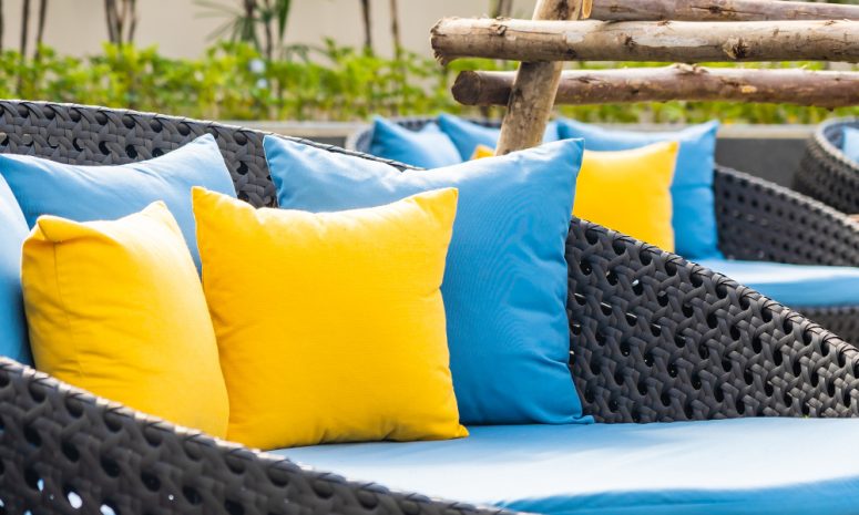 • Pentru mobilierul textil (perne, huse, șezlonguri), alege țesături outdoor cu proprietăți hidrofuge, cum ar fi olefinapoliesterul tratat sau textilena. Acestea nu absorb apa și se usucă rapid.